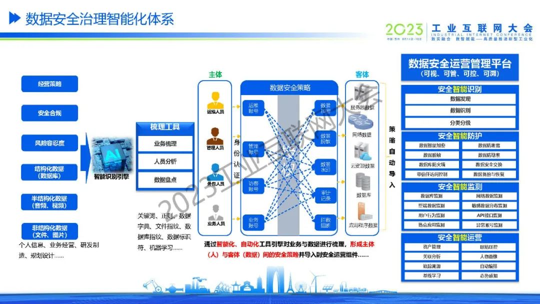 “數據安全策略是通過智能化、自動化工具引擎對業務與數據進行梳理,形成主體(人)與客體(數據)間的安全策略并導入到安全運營組件。“