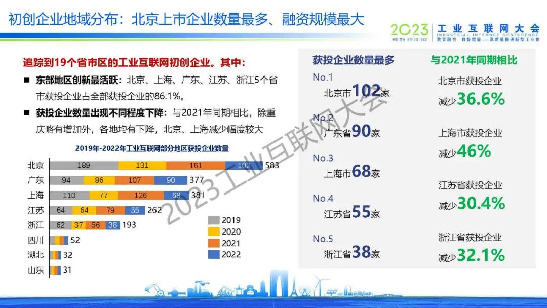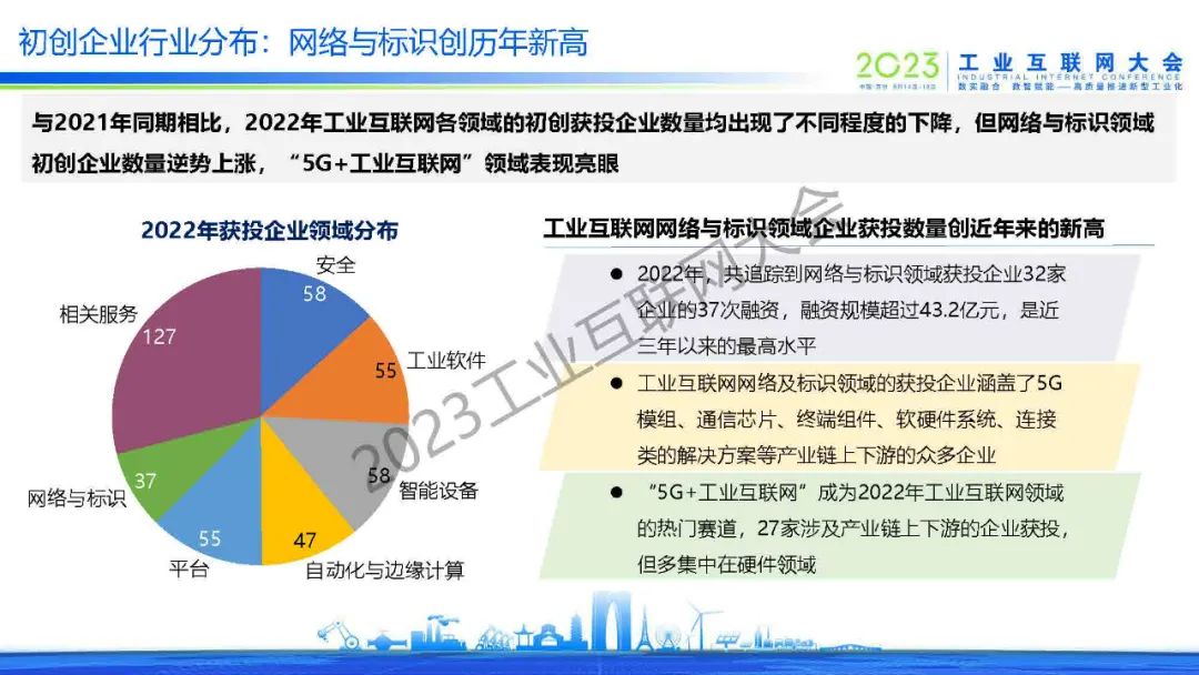 與2021年同期相比,2022年工業互聯網各領域的初創獲投企業數量均出現了不同程度的下降,但網絡與標識領域初創企業數量逆勢上漲,“5G+工業互聯網”領域表現亮眼。