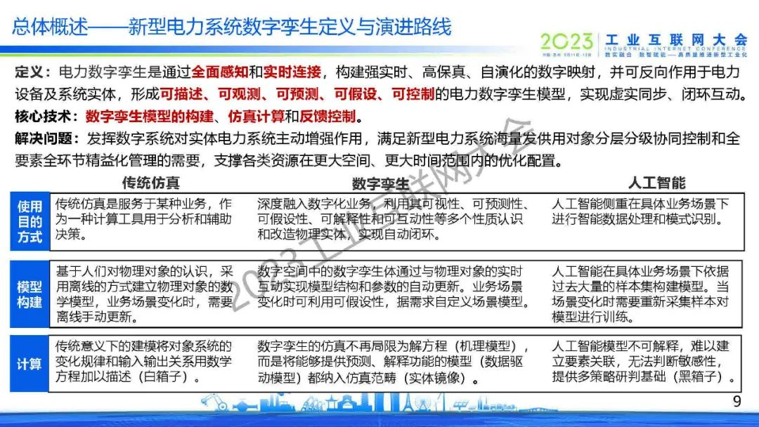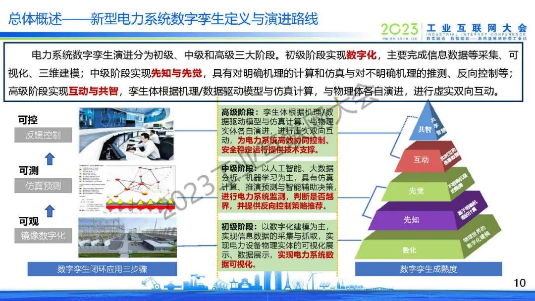 “電力系統數字孿生演進分為初級、中級和高級三大階段。初級階段實現數字化,主要完成信息數據等采集、可視化、三維建模;中級階段實現先知與先覺,具有對明確機理的計算和仿真與對不明確機理的推測、反向控制等;高級階段實現互動與共智,孿生體根據機理/數據驅動模型與仿真計算,與物理體各自演進,進行虛實雙向互動。”