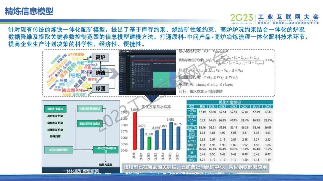 “針對現(xiàn)有傳統(tǒng)的煉鐵一體化配礦模型,提出了基于庫存約束、燒結(jié)礦性能約束、高爐爐況約束結(jié)合一體化的爐況數(shù)據(jù)降維及提取關(guān)鍵參數(shù)控制范圍的信息模型建模方法,打通原料-中間產(chǎn)品-高爐冶煉流程一體化配料技術(shù)環(huán)節(jié),提高企業(yè)生產(chǎn)計劃決策的科學(xué)性、經(jīng)濟性、便捷性。”