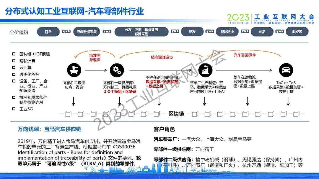 孫振華指出,分布式認知工業互聯網首次將區塊鏈、隱私計算、知識圖譜技術應用到工業互聯網平臺。并分享了分布式認知工業互聯網在汽車零部件行業、鋼鐵行業、油氣數字監管平臺、物流行業和產業大腦的相關應用。