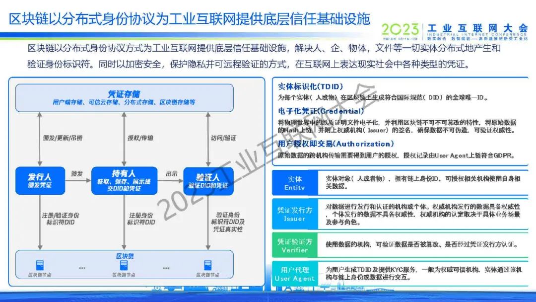 敖萌表示,區塊鏈以分布式身份協議方式為工業互聯網提供底層信任基礎設施,解決人、企、物體,文件等一切實體分布式地產生和驗證身份標識符。同時以加密安全,保護隱私并可遠程驗證的方式,在互聯網上表達現實社會中各種類型的憑證。