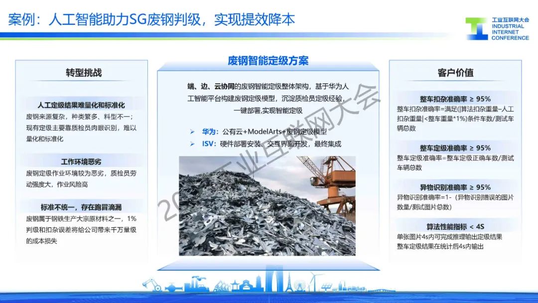 胡罡介紹,鋼鐵行業處在數字化轉型的爆發期,智能化應用不斷涌現,在這過程中還面臨著信息系統、數據標準和環保等主要挑戰。目前,通過建設基于工業互聯網架構的智慧鋼廠,來實現”提質、降本、增效“的目標,同時引入人工智能行業大模型,降低AI開發門檻,實現AI應用“工業化”開發,開啟鋼鐵行業智能化。