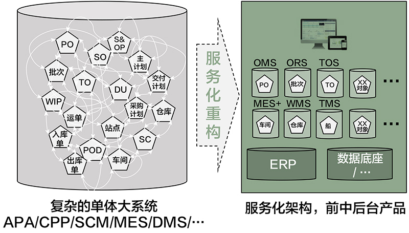 傳統(tǒng)的供應(yīng)鏈IT系統(tǒng)是煙囪式的,隨著業(yè)務(wù)增長、需求變化加快,會出現(xiàn)用戶體驗差、重復(fù)建設(shè)、響應(yīng)周期長等問題,不能適應(yīng)業(yè)務(wù)發(fā)展的需要。通過對復(fù)雜的單體大系統(tǒng)進行服務(wù)化改造,讓服務(wù)化子系統(tǒng)融合業(yè)務(wù)要素、應(yīng)用要素和數(shù)據(jù)要素,可以實現(xiàn)業(yè)務(wù)、數(shù)據(jù)與系統(tǒng)功能的銜接(如圖2)。
