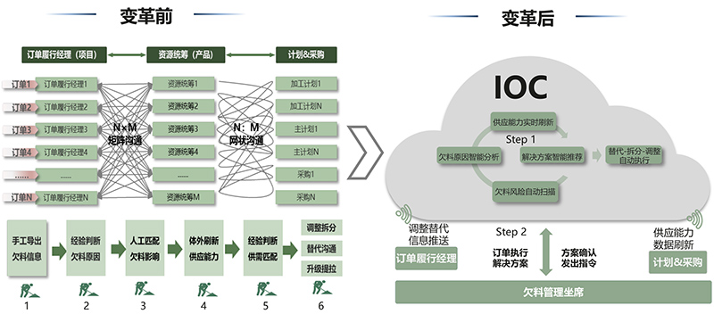 IOC打破了功能的“墻”和流程間的“堤”,實現(xiàn)關(guān)鍵業(yè)務(wù)場景下跨功能、跨流程和跨節(jié)點的合成運營,以及異常發(fā)現(xiàn)與問題解決之間的快速閉環(huán)。以華為深圳供應(yīng)中心訂單履行異常管理為例(如圖4):在變革前,訂單履行異常管理是一項高能耗業(yè)務(wù),需要100多名訂單履行經(jīng)理分別與統(tǒng)籌、計劃、采購等角色溝通,再進行分析和處理;構(gòu)建IOC后,系統(tǒng)可以自動發(fā)現(xiàn)異常、定位、分析原因并提供方案建議,從之前的人工操作變成了系統(tǒng)自動處理加人工輔助確認,作業(yè)效率提升了31%。