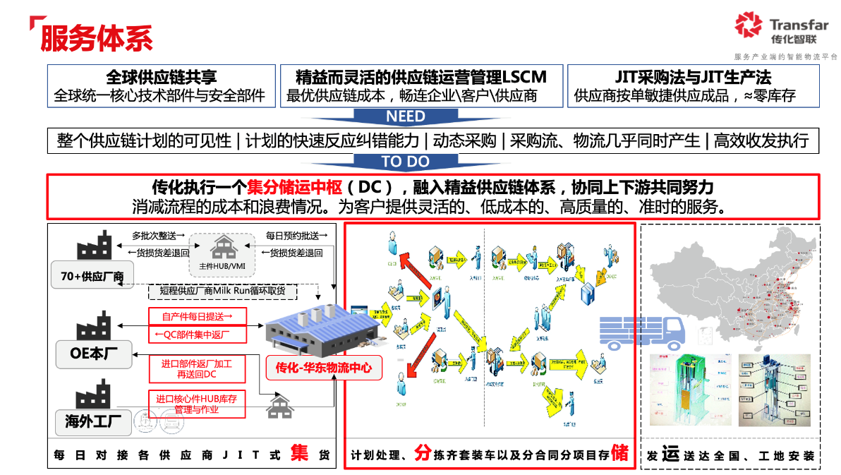 基地倉服務——定制化建設華東物流中心,提供年2.8萬臺整梯的集分儲運配服務杭州傳化公路港1.58萬平場地+32自營專業團隊+12臺叉車+行吊+生命線+智能系統+智能監控硬件