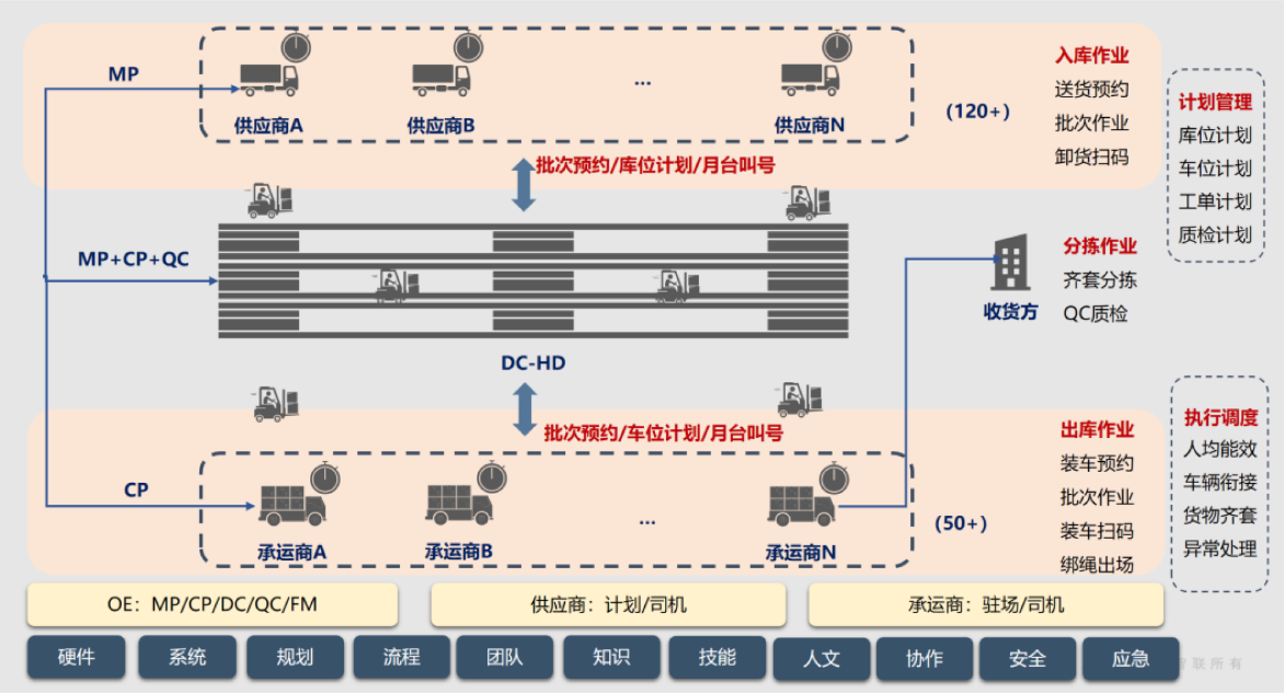 供應鏈上下游之間產供銷訂單計劃預測協同性不夠,導致物流執行效率、庫存、成本壓力面臨挑戰;大量供應商與客戶提貨車輛,場地擁堵,作業效率受限,挑戰安全管理緩沖停車場地與廠區DC分離,調度困擾,溝通成本高,無效等待時間長;工廠的周邊為貨車禁行區,高速口關閉,交通困局,物流難暢其流;供應鏈物流提升的需求(首先倉儲發運、后期物流整合) ,打破各地孤島。