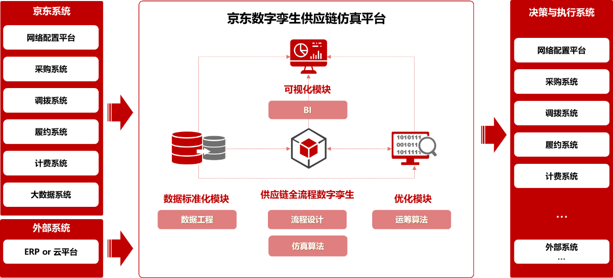 京東數字孿生供應鏈仿真平臺允許業務對現狀的生產系統及業務流程進行數字建模,同時也支持業務對未來可能的供應鏈模式進行流程設計,評估新流程的可行性及優化結果。基于對不同策略仿真結果的分析,最終將優化后的策略落實到執行系統進行實施。京東供應鏈仿真平臺搭建了一套標準化的供應鏈框架,為了能夠靈活適配零售不同業務模式及不同行業特性,以模塊化的形式進行了產品架構設計,各模塊彼此解耦,獨立迭代,可以支持豐富的應用場景。