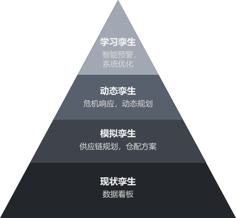 根據業務需求、能力差異、技術水平等方面,可以將數字孿生供應鏈仿真平臺分為四個階段,從下往上依次是現狀孿生、模擬孿生、動態孿生、學習孿生。