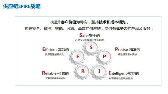 中興通訊在 2018 年 11 月發布了 SPIRE 供應鏈戰略 ,在戰略中我們明確要以提升  客戶價值為導向 ,堅持技術和成本領先 ,構建安全、精準、智能、可靠、高效的供應鏈 ,