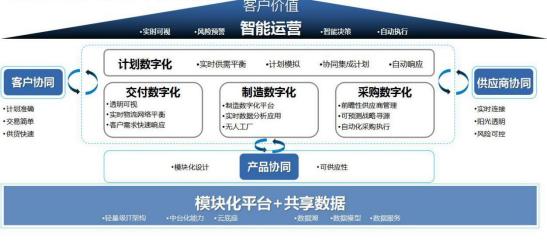 在數化轉型的業務框架方面 ,我們主張對基礎系統要進行模塊化建設 ,再加上共 數據 ,就是數字化轉型的基礎 ,核心部分是交付、制造、采購業務數字化 ,通過計劃 數字化的控塔拉通 ,對內協同產品與研發對外協同客戶與合作伙伴 ,通過智能運營平 最終為客戶增加價值。