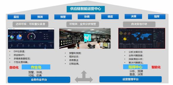 應鏈智能運營中心不是一個供應鏈業務操作平臺,它是一個供應鏈端到端指揮和 管理平臺,通過統一指揮,實現組織間高效協同,快速響應需求,提升運營效率 ;它可以分三 層架構,第一層是基礎層,實現供應鏈業務線上可視、風險預警 ;第二層是數據驅動預測 性分析,通過基于業務場景構建算法模型,對發現問題進行根因分析及未來趨勢判斷 ;第 三層是自動執行層,它基于預測分析、場景模擬分析,通過機器學習自改善,給出問題或 善建議,并自動執行形成閉環。