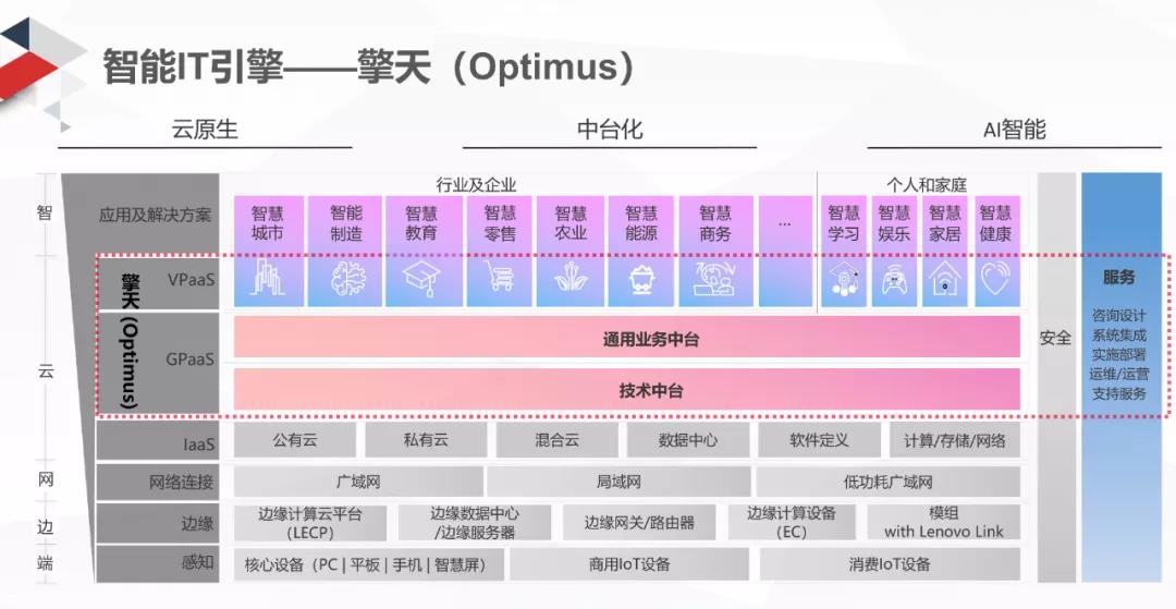 聯(lián)想智能IT引擎“擎天”是基于“端-邊-云-網(wǎng)-智”新IT架構(gòu)的內(nèi)核,包含了技術(shù)中臺和通用業(yè)務中臺的GPaaS層,以及面向不同行業(yè)領域的VPaaS層,具有云原生、中臺化、AI智能三大技術(shù)特征。