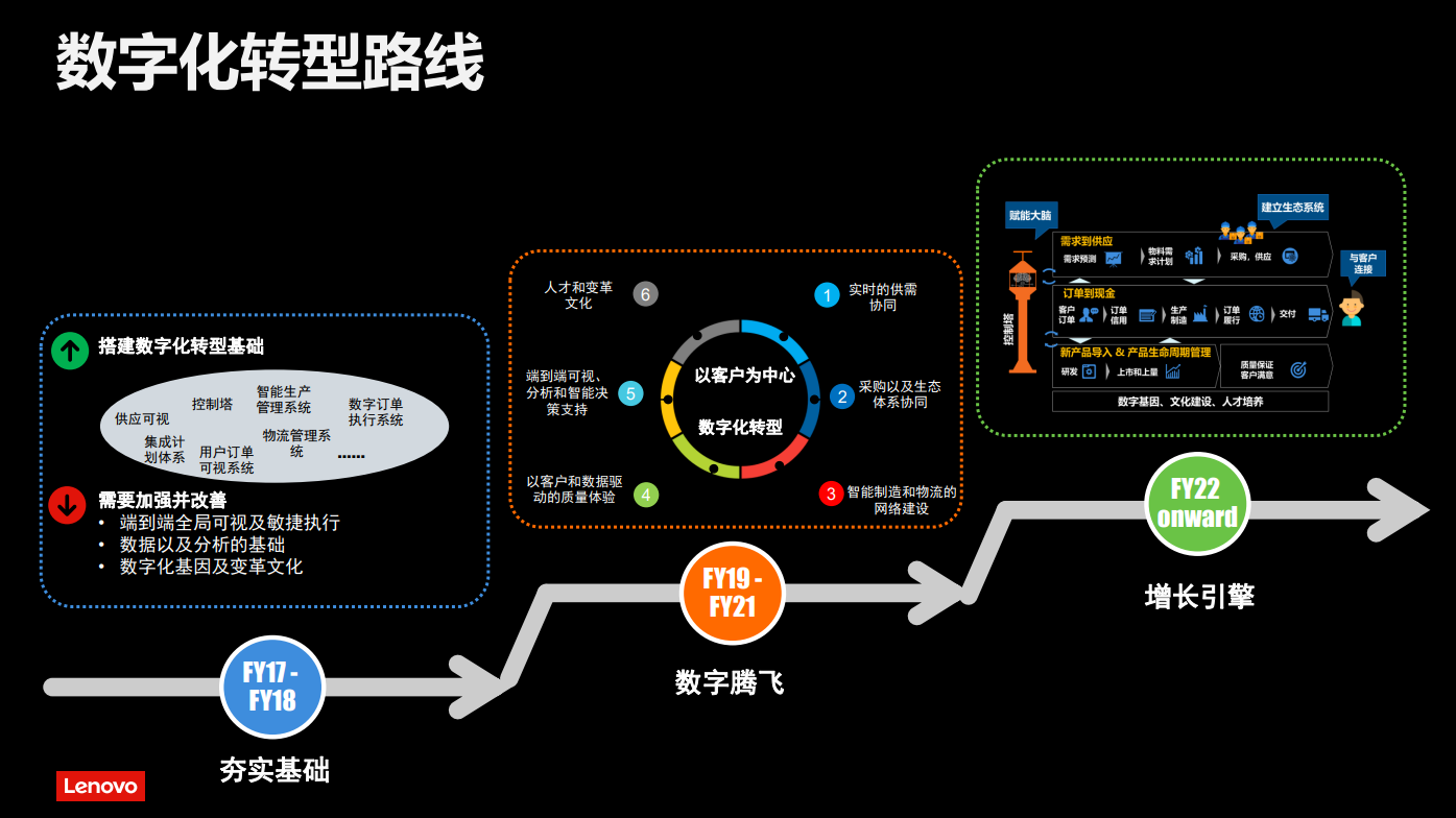 2017-2019年是聯(lián)想數(shù)字化轉(zhuǎn)型全面推廣的階段,在這段時間,聯(lián)想著重于向數(shù)字化原生組織轉(zhuǎn)型,以數(shù)字化技術(shù)引領數(shù)字化業(yè)務創(chuàng)新: