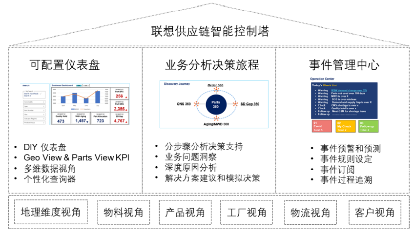 供應鏈智能控制塔是供應鏈運作的指揮中心。控制塔提供了全方位視角,打通 了端到端的數(shù)據(jù)鏈接,能更全面的從客戶、區(qū)域、運輸、物料、產(chǎn)品,工廠等不同維度來審視 供應鏈的業(yè)務問題和改進點。功能特性包含了可配置儀表盤、業(yè)務分析決策旅程和業(yè)務事件管 理中心。