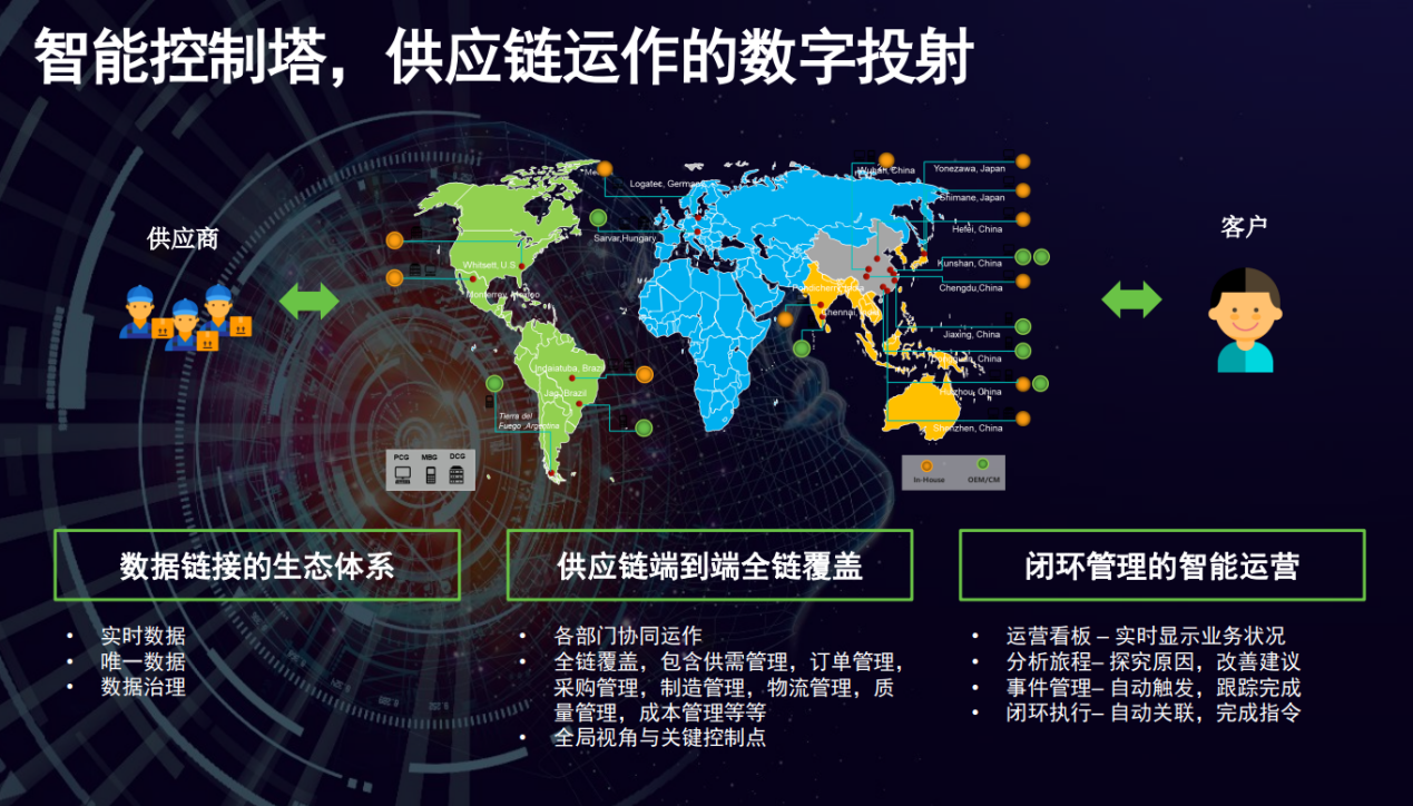聯(lián)想供應鏈智能控制塔以客戶為中心,構(gòu)建包括計劃、采購、制造、物流、質(zhì)量、服務等環(huán)節(jié)的一體化協(xié)同,力求在供應鏈生態(tài)體系內(nèi)實現(xiàn)全面運營最優(yōu)化方案運作,提升整體運作效率。