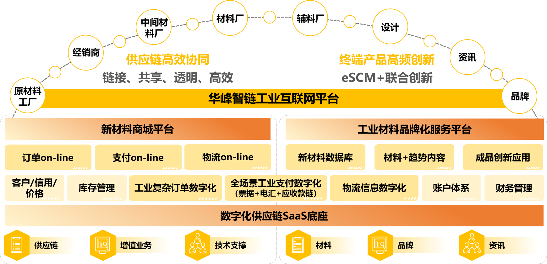 業(yè)務(wù)架構(gòu):圍繞供應(yīng)鏈運營要素,華峰智鏈為華峰集團設(shè)計并打造數(shù)字化供應(yīng)鏈SaaS底座,實現(xiàn)工業(yè)復(fù)雜訂單數(shù)字化、全場景工業(yè)支付數(shù)字化(票據(jù)支付+大額電匯支付+應(yīng)收款鏈支付、物流信息數(shù)字化、客戶/信用/價格管理、庫存管理、賬戶體系管理、財務(wù)管理等功能;在強大的SaaS底座基礎(chǔ)上搭建新材料商城平臺,支持訂單+支付+物流在線集成,賦能產(chǎn)業(yè)供應(yīng)鏈高效協(xié)同。未來,還將搭建工業(yè)材料品牌化服務(wù)平臺,搭載新材料數(shù)據(jù)庫、材料+趨勢內(nèi)容、成品創(chuàng)新應(yīng)用等模塊,賦能終端產(chǎn)品高頻創(chuàng)新。