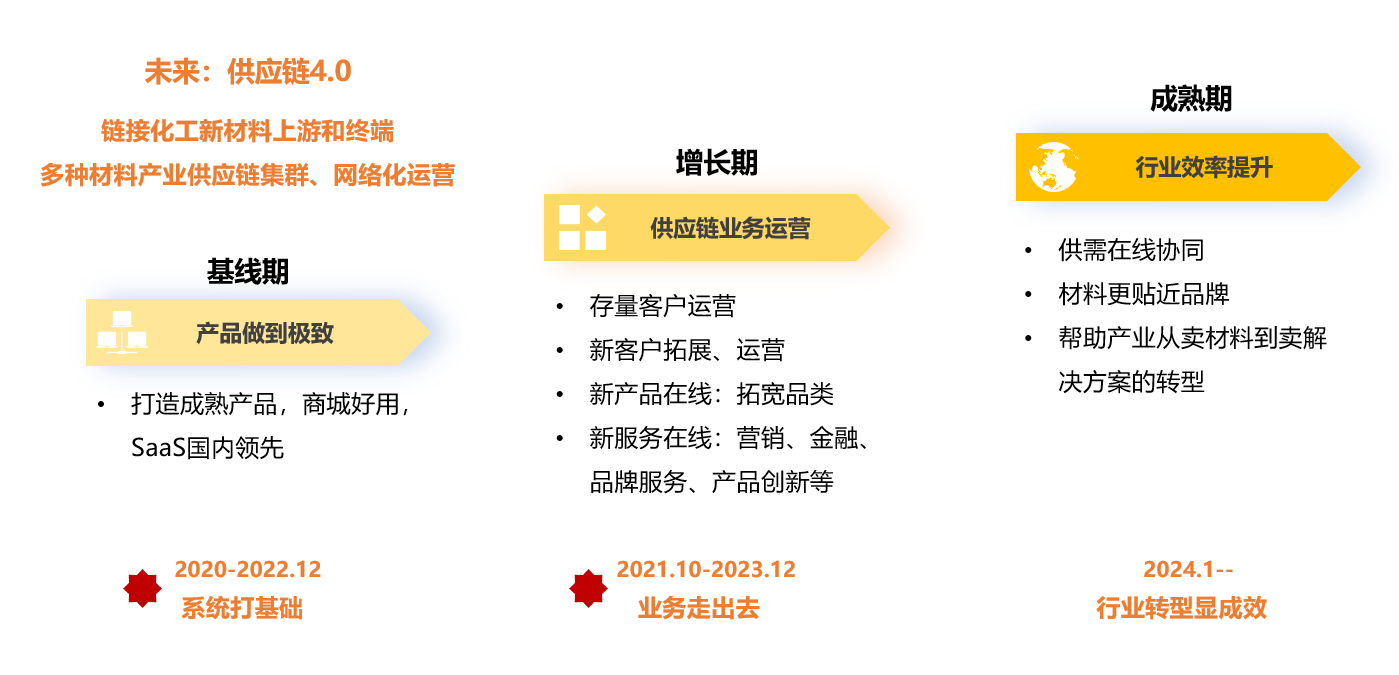 基線期的核心任務(wù)是完成SaaS平臺的打造,以華峰集團旗下各產(chǎn)業(yè)公司的交易場景為試點,完成聚焦在復(fù)雜工業(yè)訂單線上化、工業(yè)支付線上化、物流數(shù)據(jù)在線和開放商城平臺打造,具備產(chǎn)業(yè)內(nèi)和外部客戶推廣的基礎(chǔ)。基線期內(nèi)的主要實施方式和路徑為:首先確定試點產(chǎn)業(yè),平臺從2018年開始選擇華峰超纖作為首批上線試點產(chǎn)業(yè)公司,搭建了下單+票據(jù)支付模塊,完成訂單基礎(chǔ)功能搭建;至2020年全面升級2.0版本,該版本支持華峰新材料、華峰氨綸上線,進一步完善了自主下單+邀約下單的模式以及完成票據(jù)、電匯、轉(zhuǎn)賬等全場景支付工具功能部署2021年進入從內(nèi)部平臺到商城開放,產(chǎn)業(yè)上線擴大到8個大品類,同時拓展下游客戶作為賣家上線,對外提供SaaS服務(wù)。