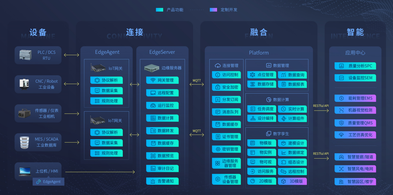 針對用戶的設備連接、系統協同、數據分析等需求,邊緣接入、數據采集、時序存儲、數據計算、數字孿生、數據可視化等能力、為企業提供從現場設備、傳感器、儀表接入到智能應用服務的端到端解決方案,構建智能監測系統,實現工廠設備運行狀態、各位置耗能耗電情況、產品生產質量等實時遠程監測。優化、創新乃至重構企業戰略決策、產品研發、生產制造、經營管理、市場服務業務活動,構建數據驅動型高效運營管理模式。是各類制造企業數字化、智能化轉型、實現卓越運營的強大利器。
