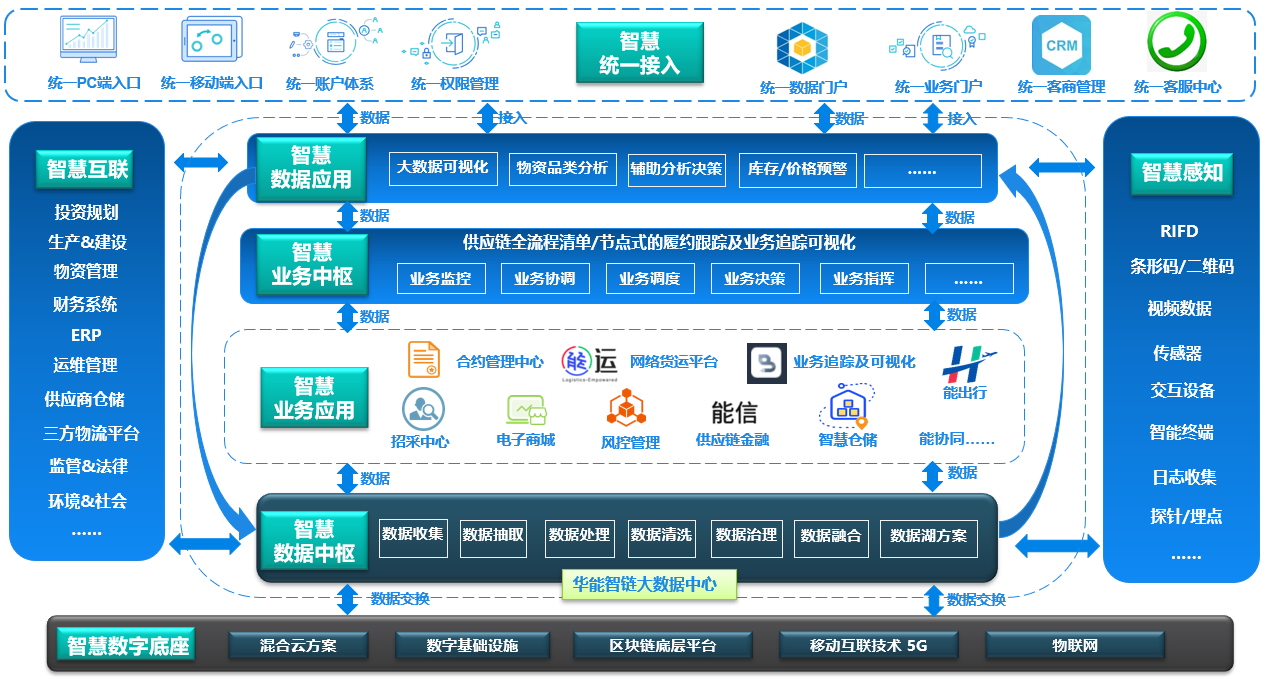 首先針對各業務模塊,構建核心智慧業務應用層:包括電子商城平臺、智慧物流平臺、智慧集中倉儲平臺、智慧供應鏈金融平臺、物資業務追蹤與可視化平臺、合約管理中心、項目履約跟蹤平臺、智慧風控系統、能出行智慧商旅系統、統一客商管理系統。