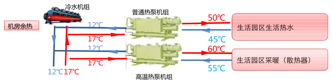 機房余熱回收技術應用。項目配套建設了集中余熱回收系統,規劃為整個園區辦公區域提供冬季采暖熱源,全部采暖熱源由機房設備產生余熱供給。通過采用水源熱泵機組,與空調系統的冷凍水回水進行熱交換,為園區輔助用房提供采暖和生活熱水,充分利用系統余熱,提高能源綜合利用率。僅一期余熱回收系統就實現了辦公區域總建筑面積44336.12㎡的供暖,節省了巨額的冬季采暖費用,等效節約電量321萬度。哈爾濱數據中心也在探索與供暖商合作模式,余熱回收在滿足園區內需求基礎上,進一步擴大應用范圍,為全社會碳減排做出貢獻。