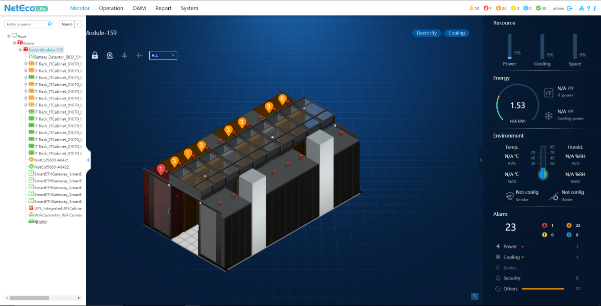 采用3D模擬仿真技術,實現資源圖形化和可視化,對機房、機架、設備上下架等進行3D模擬仿真,保證界面與數據庫信息的一致。實現對機房容量、負荷能力的形象化、精細化展現。點擊架構中的設備可跳轉至設備的具體位置。通過CFD仿真及溫度云圖展示,指導優化機房氣流組織,確保運行安全并提升機房溫度,可有效地達到節能效果,降低機房制冷能耗。