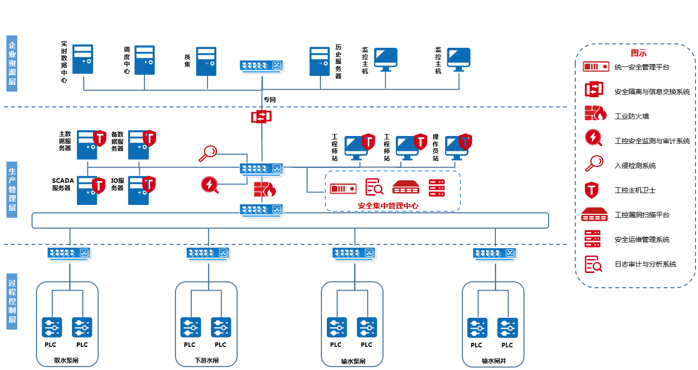 面對越來越嚴峻的信息安全形勢,我國高度重視工業控制系統信息安全工作。 20161017日,工信部信軟〔2016338《工業控制系統信息安全防護指南》正式頒布,指出工業控制系統應用企業應從安全軟件選擇與管理、配置和補丁管理、邊界安全防護、物理和環境安全防護、身份認證、遠程訪問安全、安全監測和應急預案演練、資產安全、數據安全、供應鏈管理、落實責任十一個方面做好工控安全防護工作,切實提升工業控制系統信息安全防護水平,保障工業控制系統安全。201761日起《中華人民共和國網絡安全法》正式施行,其中明確提出基礎設施的運行安全要在等級保護的基礎上實行重點防護。202191日起《關鍵信息基礎設施安全保護條例》正式實施,明確規定了關鍵信息基礎設施包括水利等重要行業和領域的重要網絡設施、信息系統等。