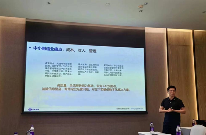 深圳云集智造系統技術有限公司首席科學家明旒介紹了云集制造智慧經營管理平臺。平臺通過全流程數字化管理,幫助中小企業在銷售管理、庫存周轉、計劃協同、生產管理、采購、委外及財務、人力資源管理等關鍵環節實現了數百億的價值提升和成本節約,有效解決了企業在制造業數字化轉型中的痛點、難點。公司目前正在尋求A輪融資。