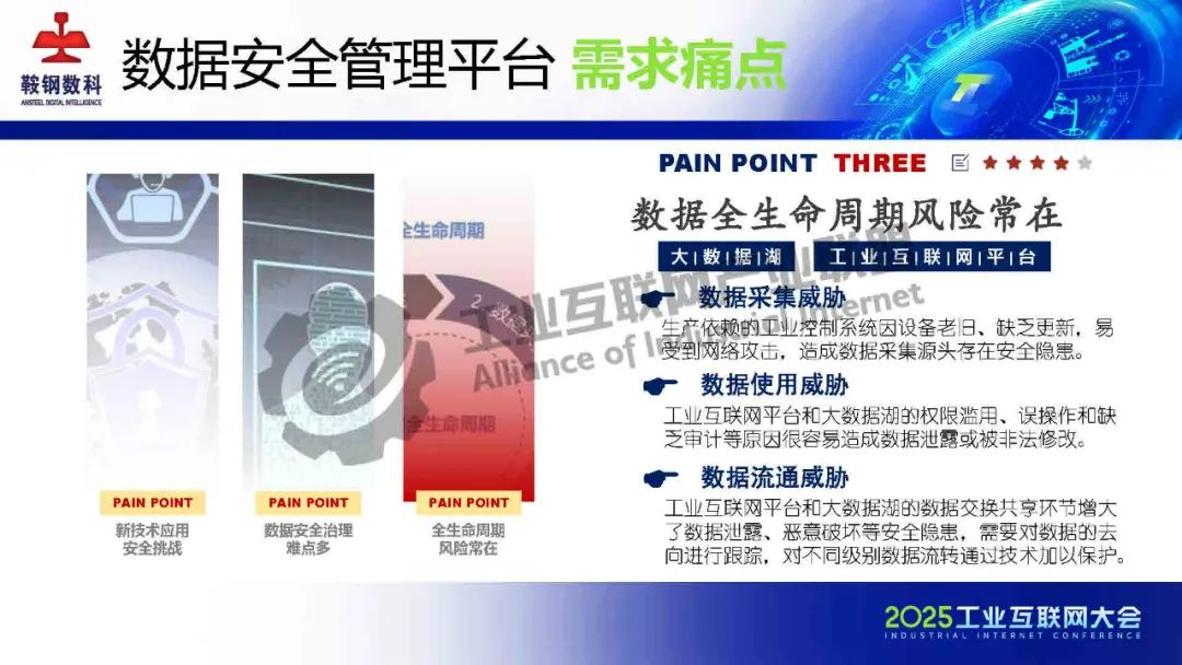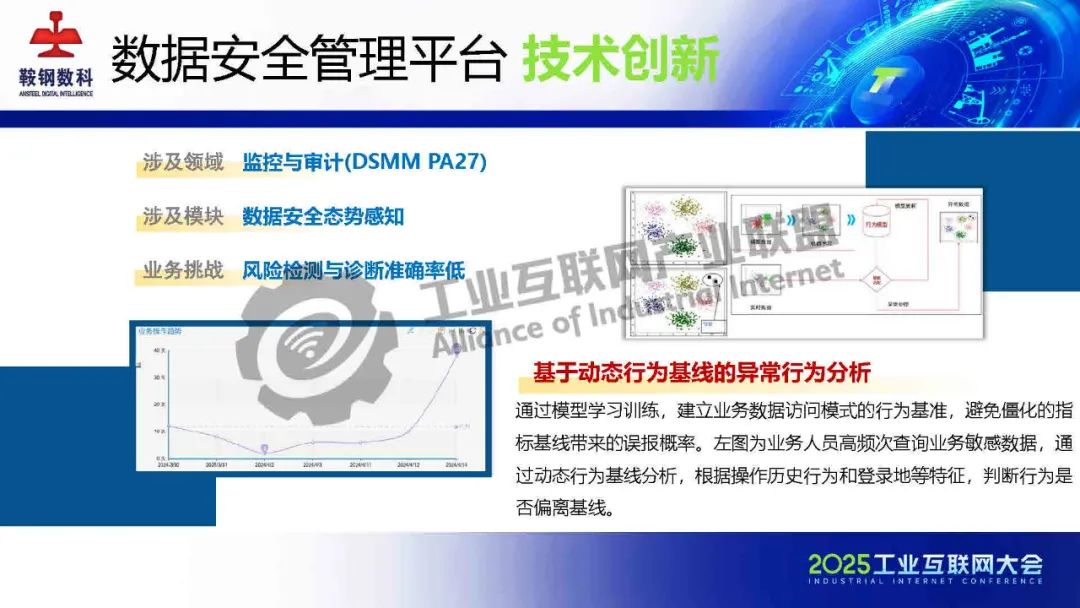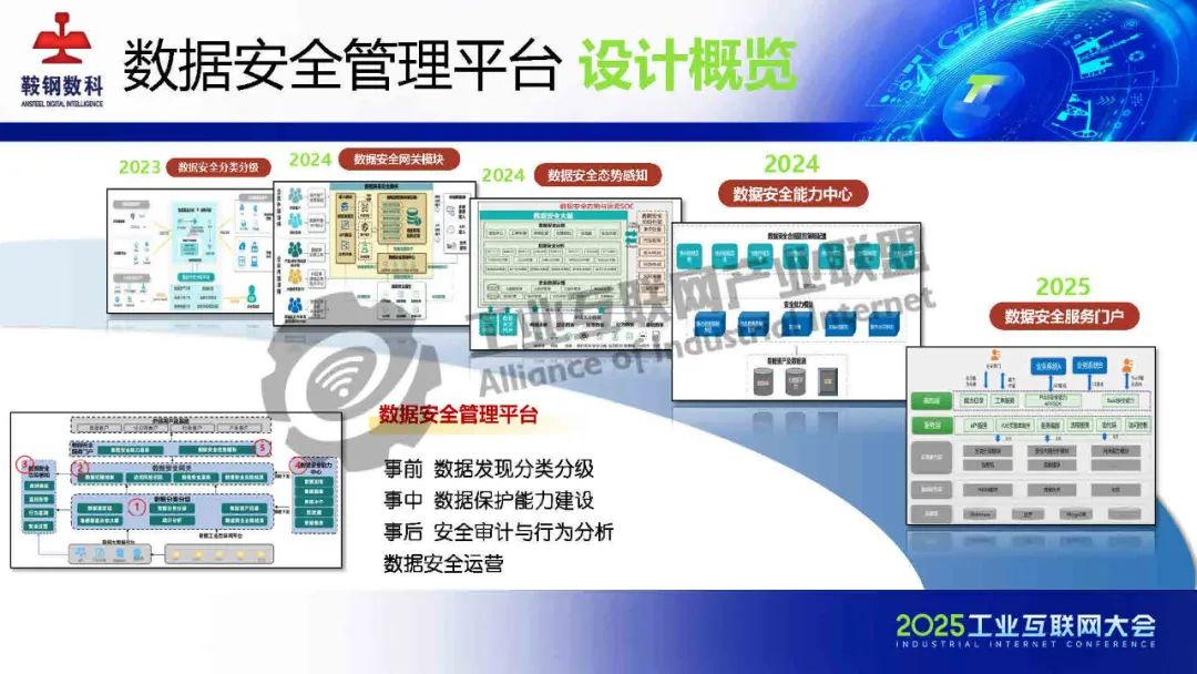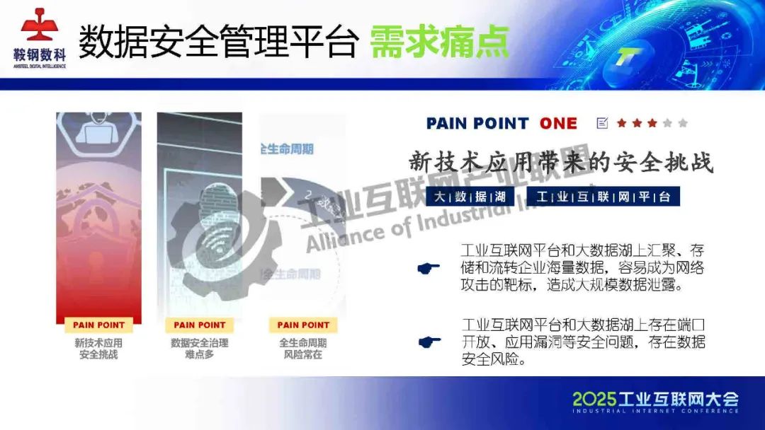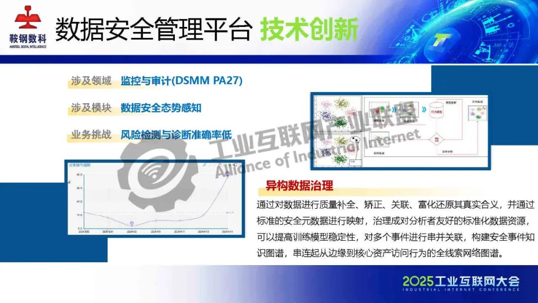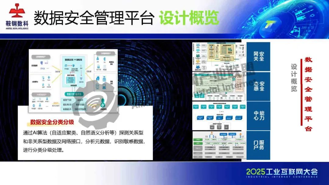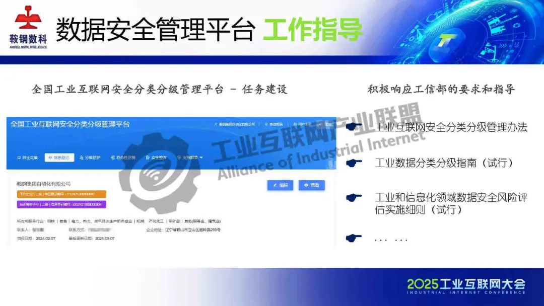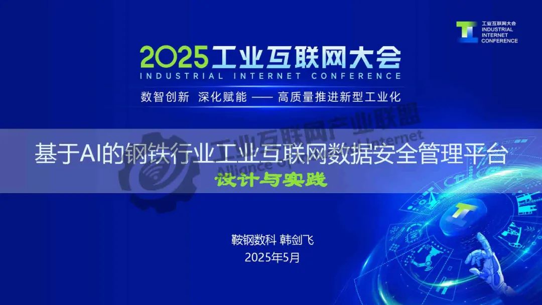 5月23日,在2025工業互聯網大會“新型工業化網絡與數據安全專題活動”上,鞍鋼數智科技(遼寧)有限公司產品研發中心網安研發經理韓劍飛發表了《基于AI的鋼鐵行業工業互聯網數據安全管理平臺的設計與實踐》的主題演講。