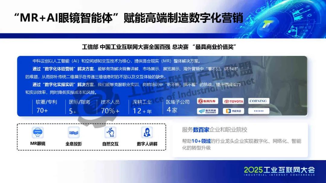 王哲介紹,中科云創針對高端制造營銷轉型困境,提出"產品+服務"和"銷售+服務"全鏈路解決方案,推動從單純賣設備向全周期價值服務升級,通過"MR+AI眼鏡智能體"技術賦能,實現從訂單交付到客戶全周期運營的數字化營銷轉型,典型實踐驗證了其有效性,未來將致力于打通"制造-銷售-服務"全鏈條協同。