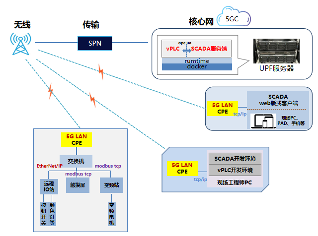 從5G UE下掛的SCADA客戶端訪問UPF服務器內置的非實時應用SCADA服務和實時vPLC業務