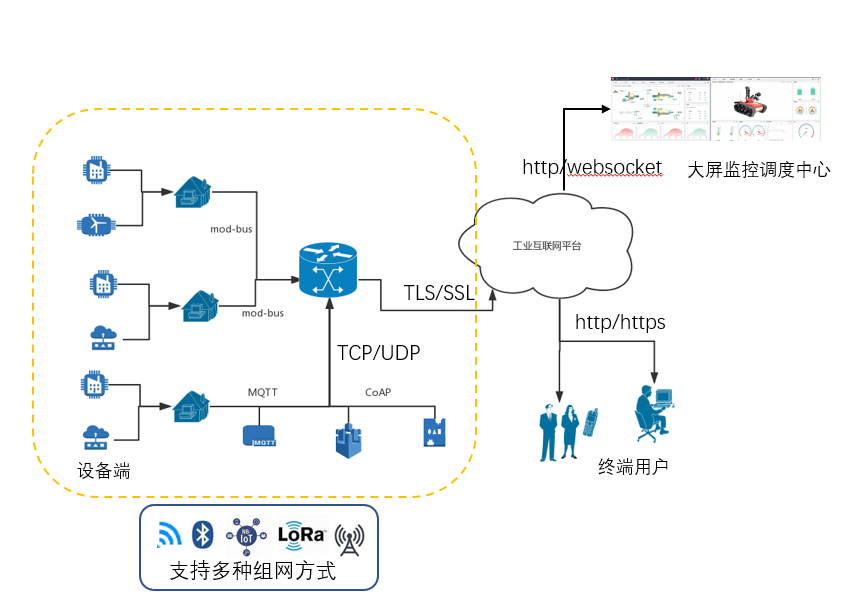本解決方案支持ModBus,MQTT,CoAP,TCP/UDP,TLS/SSL等數據采集和傳輸協議,在云端與用戶端,支持HTTP,HTTPS,WebSocket等主流標準協議。在網絡適配方面,支持WiFi,NB-IoT,LoRa,GPRS/3G/4G等。