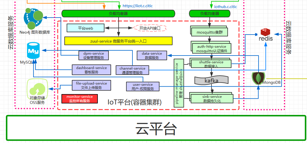 本方案涉及的平臺是基于業界開放標準完全自主開發的,擁有100%的自主知識產權。系統以微服務為開發架構,以工業互聯網平臺為核心,以自服務和SaaS化為根本宗旨。根據數據的不同用途,分別保存到MySQL, Redis, MongoDB, Neo4j圖數據庫。平臺提供開放API接口,符合云計算架構規范,可以基于公有云、私有云、混合云提供服務。